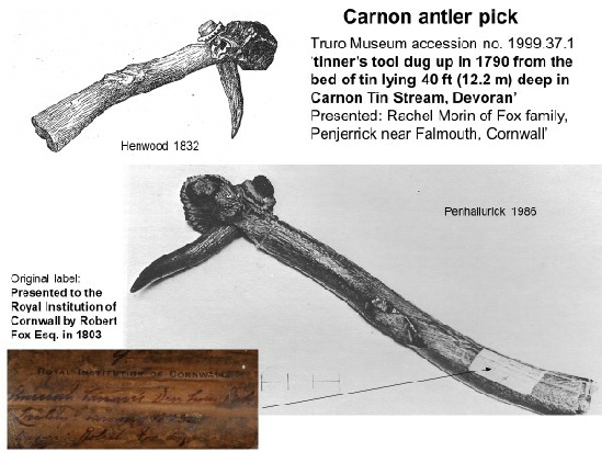 Carnon antler pick drawing and C14 date (S. Timberlake and B. Craddock)