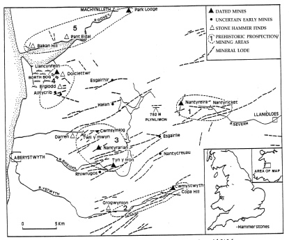 Map shows mines (triangles), mineral lodes (dotted lines) and prospection areas (S. Timberlake)